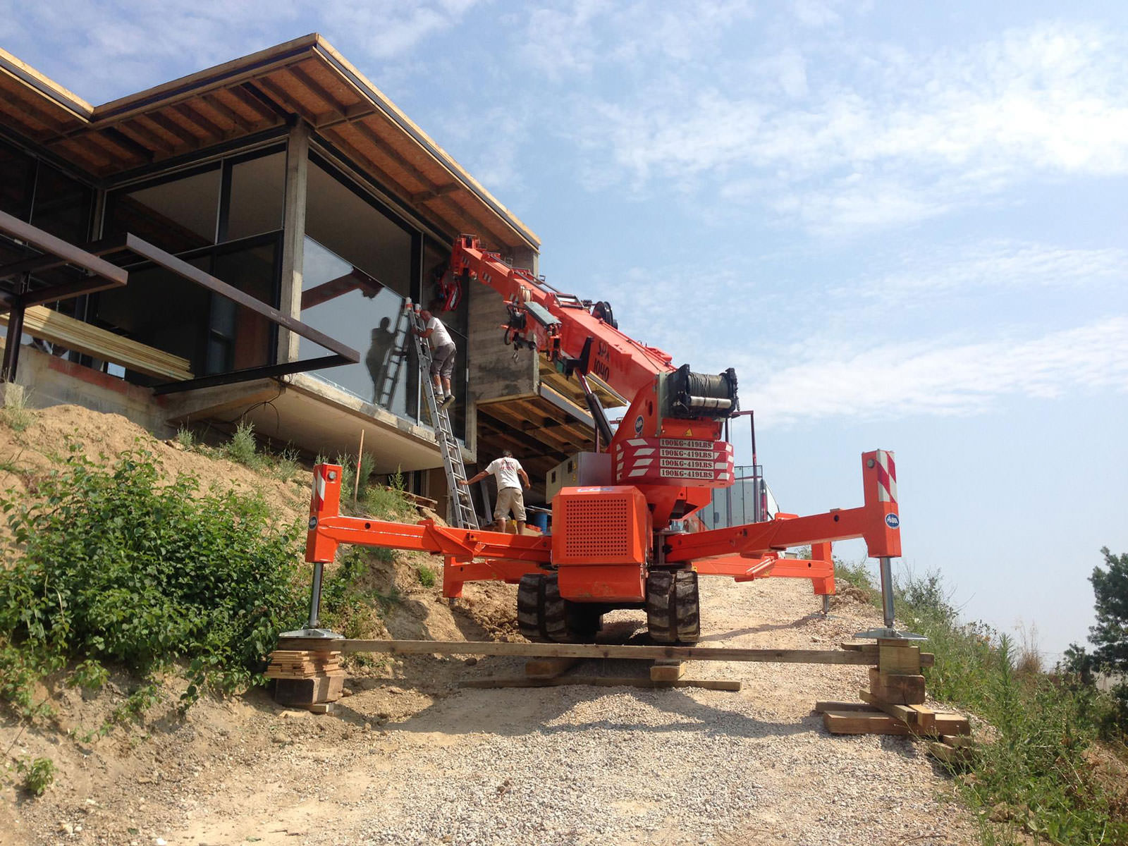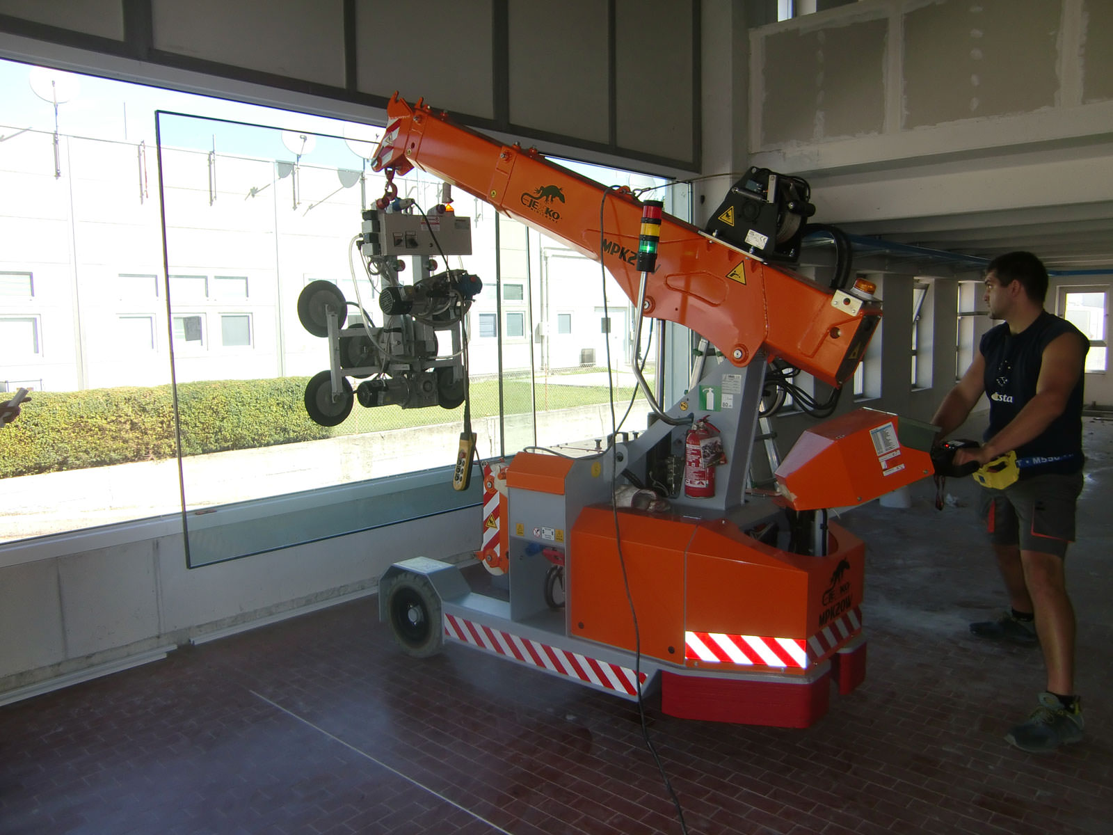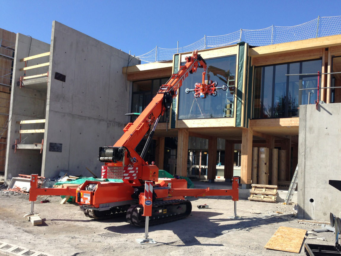 Installation af ruder og gardinvægge på bygninger og skyskrabere, håndtering af ruder og ikke-porøse materialer ved hjælp af hydrauliske manipulatorer og vakuumløftere integreret i vores kraner.